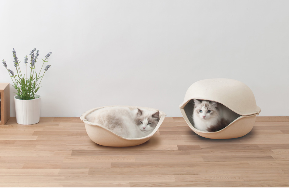2個合わせてドーム型に2個のキャットシェルを上下に合わせると、2つの貝殻(シェル)を合わせたような、表情のある形になり、猫ちゃんにとって少し隠れることの出来る落ち着いた居場所になります。