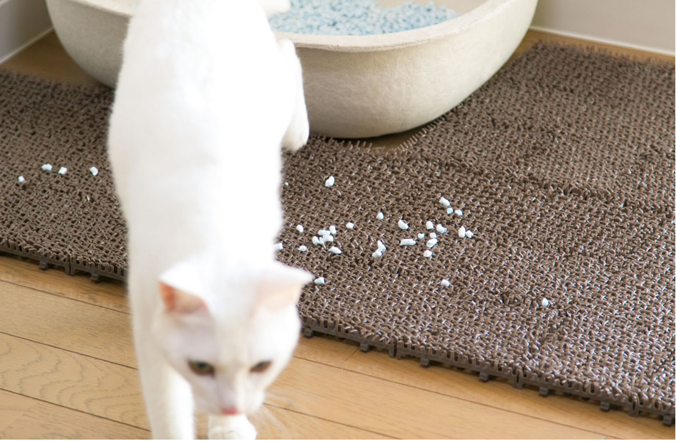 猫のトイレマットは入口前だけに敷くタイプがほとんどで、トイレ周りには砂が飛び散り、飼い主さんのお掃除の手間になっています。