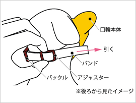 バックルをとめて、アジャスターを持ち、バンドを引くとサイズ調整ができます。もしくは、愛犬の頭が通るくらいの大きさでバックルをとめ、その状態で頭から被せてマズルに口輪をはめてバンドの調整をする方法もあります。