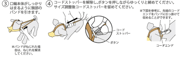 | 材質 | 口輪本体:シリコン(中国)、バンド:ポリプロピレン、 コードストッパー・コードエンド・ホック:POM、 ボタン:ナイロン樹脂 |